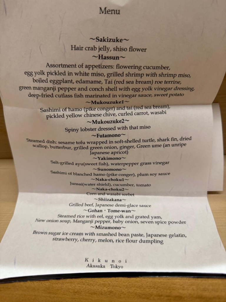 My husband had dinner at Kikunoi Akasaka, a three-star Michelin restaurant, of typical Kyoto cuisine (we didn’t realise this when we booked, as my husband would have preferred something more Tokyo-focused). My husband was sat at the counter – but lots of these sorts of restaurants do not allow children – so check before you book!
