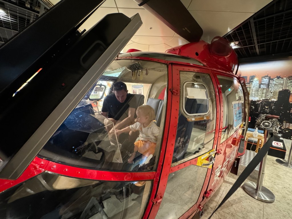 The first floor is just fire engines from different eras. They have a ride-on fire engine with an alarm that occasionally goes off. There’s lots of historical information, like beautiful attire of Samurai fire fighters and explanations of how the Sachiko holds water to ensure the wearer doesn’t catch alight. Plus, there are helicopters (indoor and outdoor), dress-up, drawing, and lots of interactive activities for kids and toddlers.