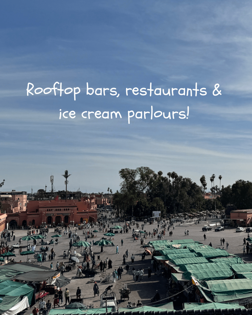 - Rooftop bars, restaurants and ice cream. We went to an amazing ice cream restaurant called Argana Marrakech which has ice cream and sorbet on the top floor overlooking the main square. We also ate at a few other rooftop restaurants which were great.